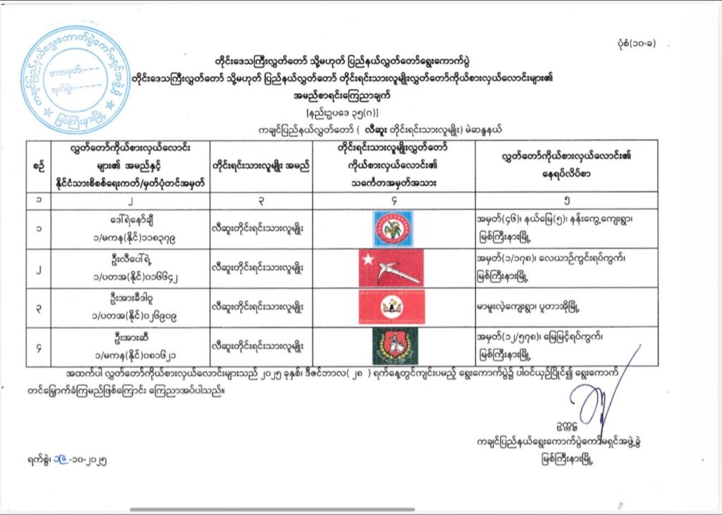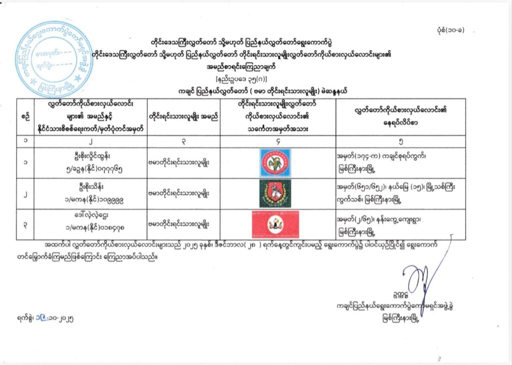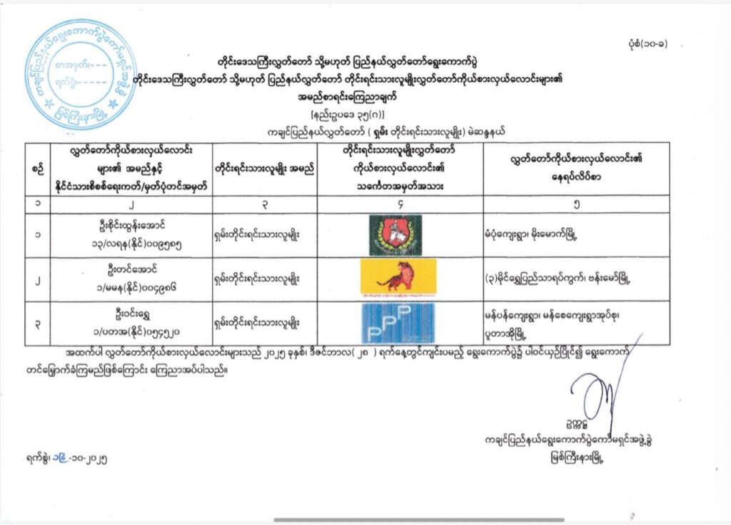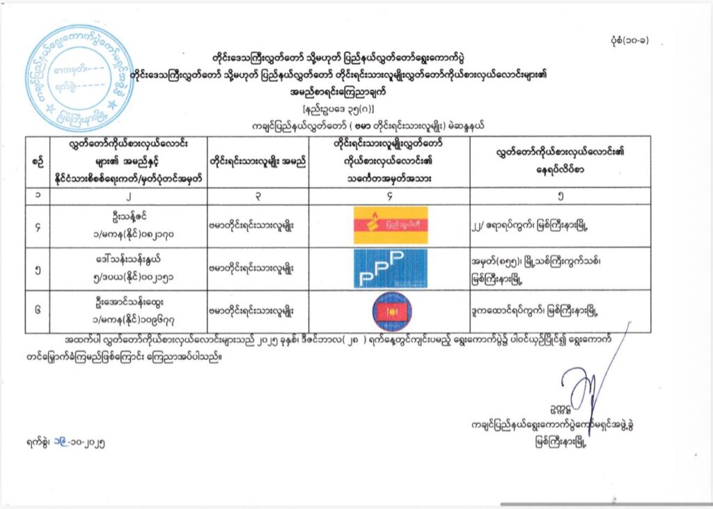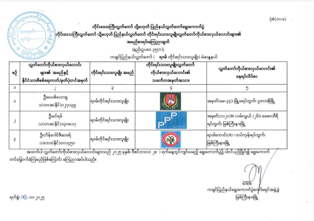 ကချင်ပြည်နယ်၊ အမျိိုးသားလွှတ်တော်(အချိုးကျကိုယ်စားပြုစနစ်-P.R)မဲဆန္ဒနယ် အမှတ်(၁၊ ၂၊ ၃၊ ၄၊ ၅၊ ၆)မှ ဝင်ရောက်ယှဉ်ပြိုင်မည့် ကိုယ်စားလှယ်လောင်းများ၏ အမည်စာရင်းကြေညာချက်