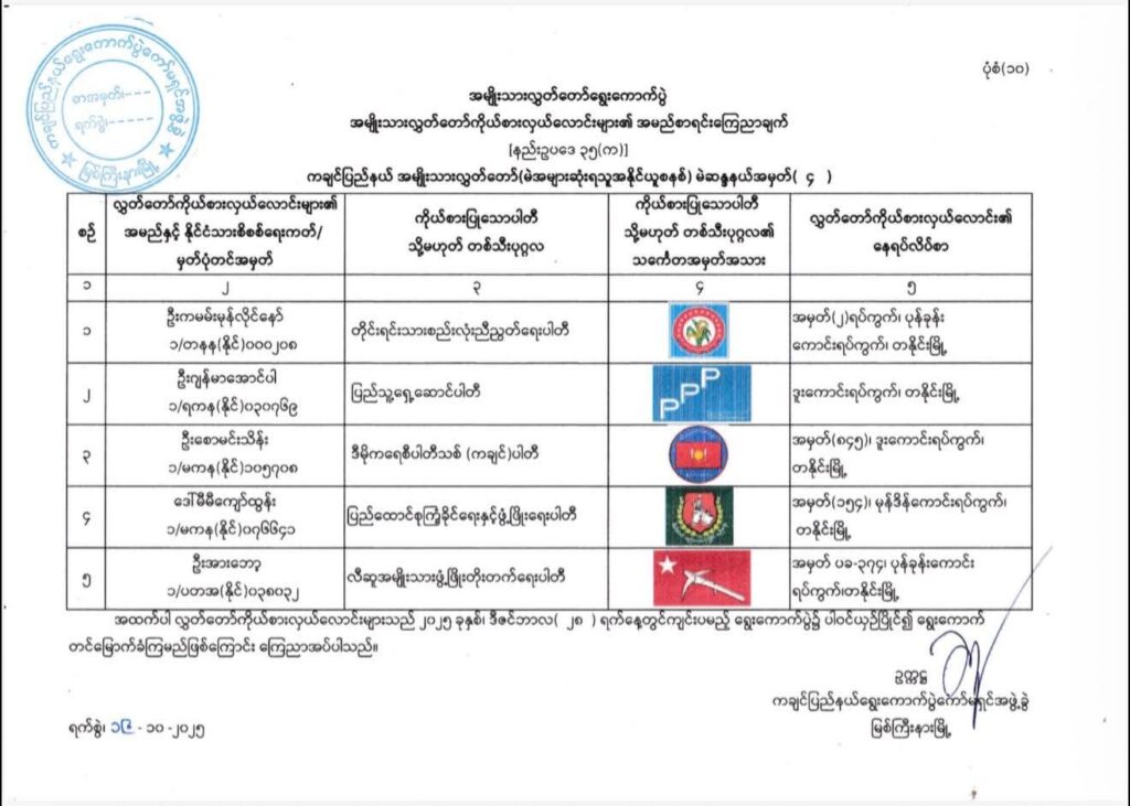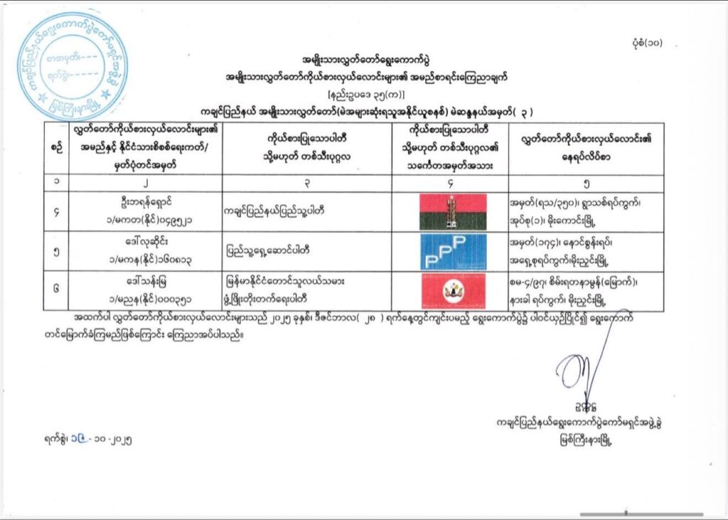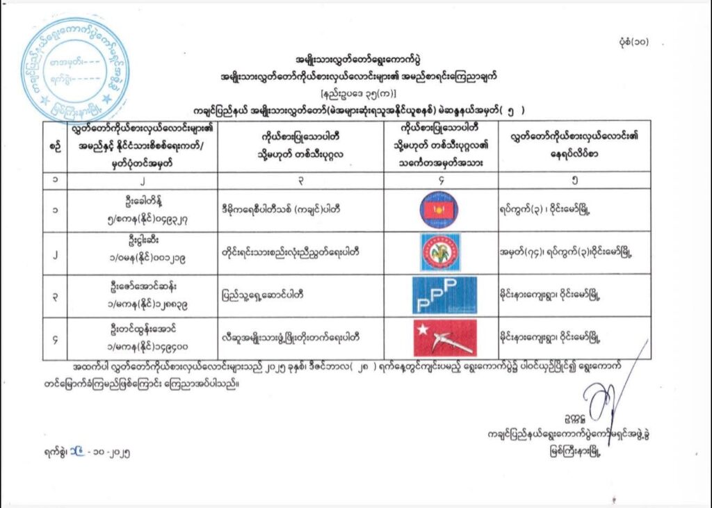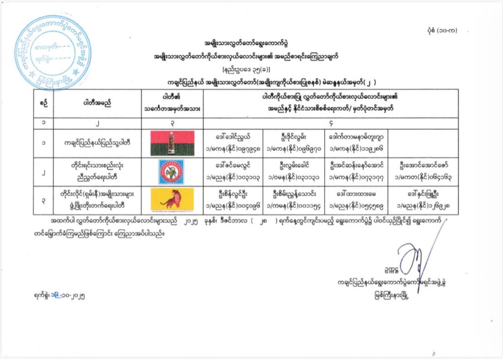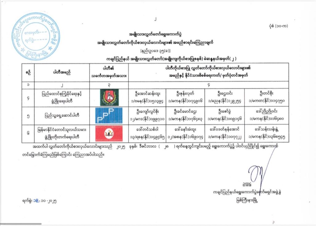 ကချင်ပြည်နယ်၊ အမျိိုးသားလွှတ်တော်(အချိုးကျကိုယ်စားပြုစနစ်-P.R)မဲဆန္ဒနယ် အမှတ်(၁၊ ၂၊ ၃၊ ၄၊ ၅၊ ၆)မှ ဝင်ရောက်ယှဉ်ပြိုင်မည့် ကိုယ်စားလှယ်လောင်းများ၏ အမည်စာရင်းကြေညာချက်