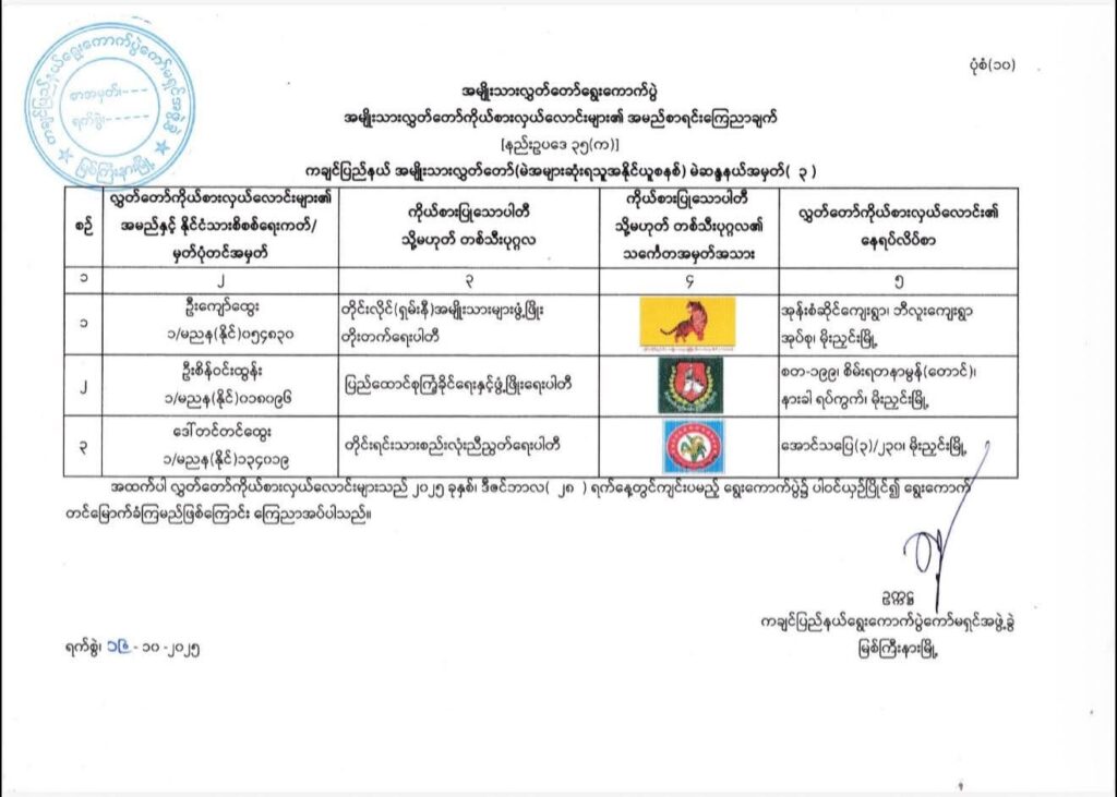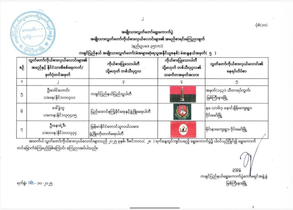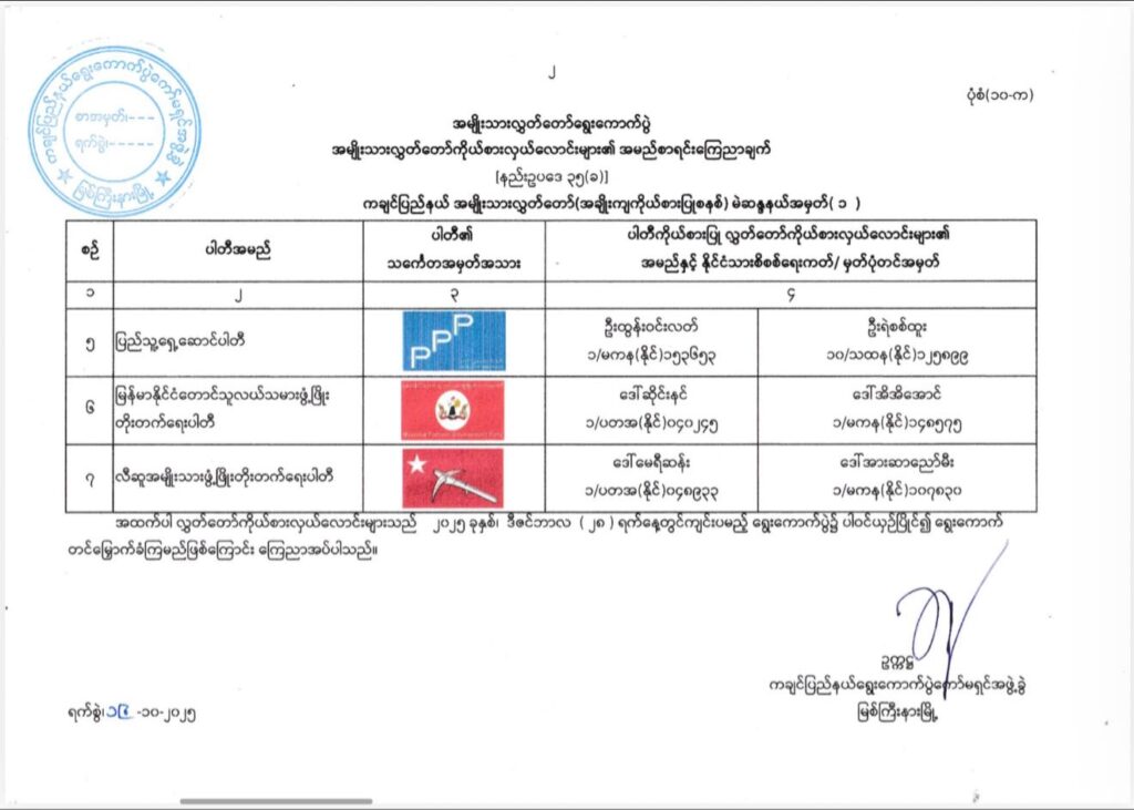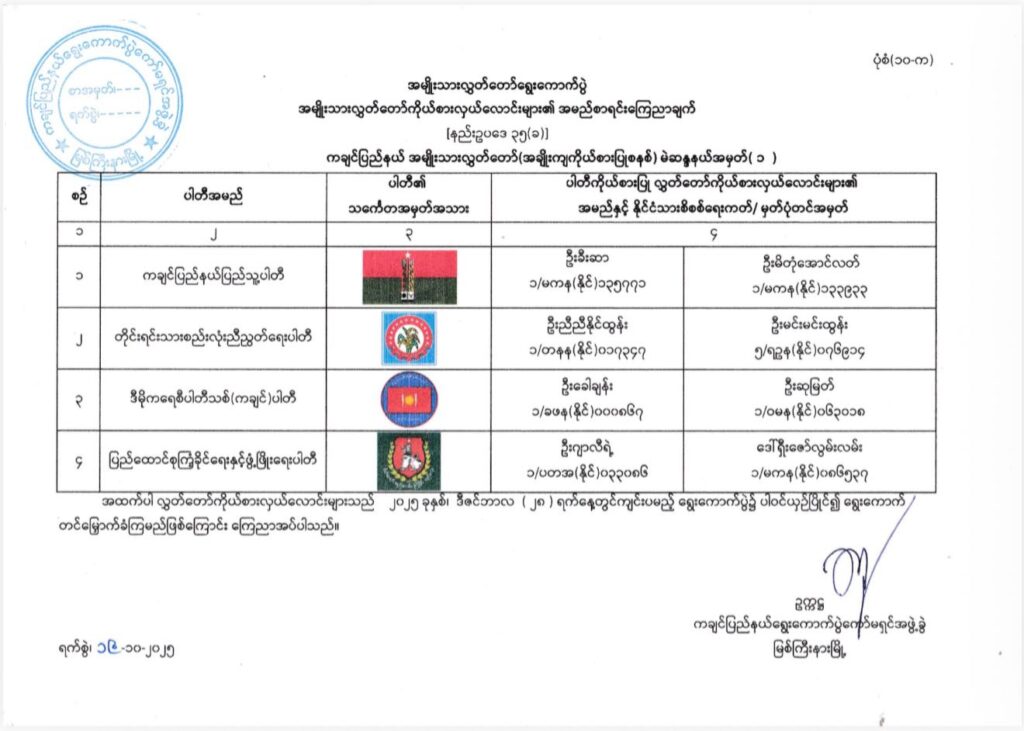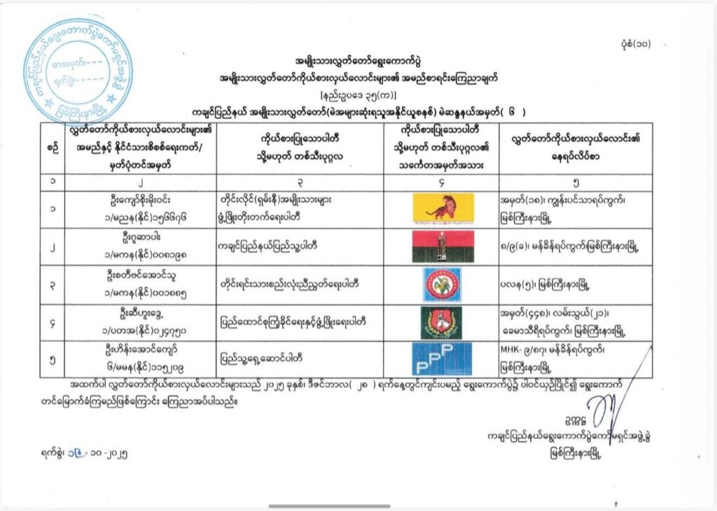 ကချင်ပြည်နယ်၊ အမျိိုးသားလွှတ်တော်(အချိုးကျကိုယ်စားပြုစနစ်-P.R)မဲဆန္ဒနယ် အမှတ်(၁၊ ၂၊ ၃၊ ၄၊ ၅၊ ၆)မှ ဝင်ရောက်ယှဉ်ပြိုင်မည့် ကိုယ်စားလှယ်လောင်းများ၏ အမည်စာရင်းကြေညာချက်