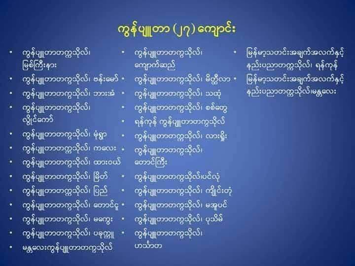 အောက်ပါတို့မှာ မြန်မာနိုင်ငံရှိ တက္ကသိုလ်နှင့် ကောလိပ်များအား ပြည်နယ်နှင့် တိုင်းဒေသကြီးအလိုက် စီစဉ်ထားသည့် စာရင်းဖြစ်သည်။