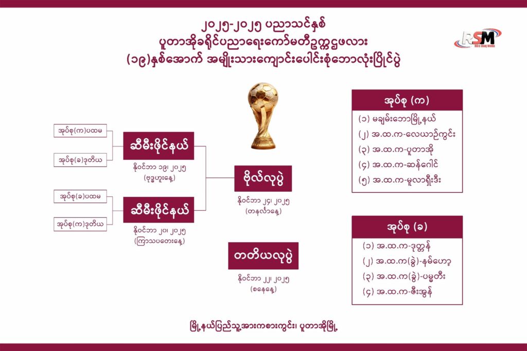 အုပ်စုအဆင့်ပွဲစဉ်များအား (၈.၁၁.၂၀၂၅) မှ (၁၈.၁၁.၂၀၂၅) အထိ တစ်ရက်လျှင် ပွဲစဉ် (၂)ပွဲ ကစားလျက်ရှိကြောင်း သိရသည်။