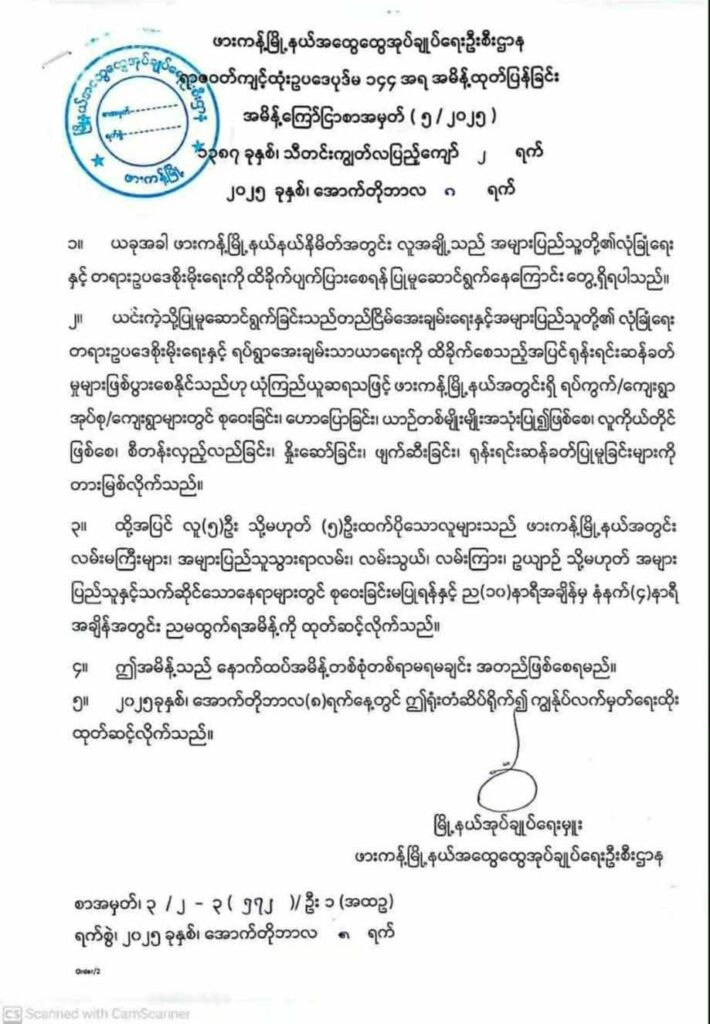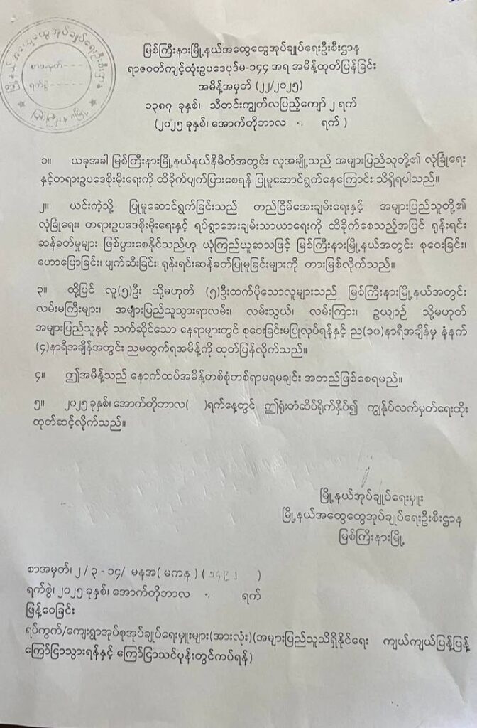 မြစ်ကြီးနားမြို့နယ်နှင့် ဖားကန့် မြို့နယ်အတွင်း ညမထွက်ရအမိန့် (ပုဒ်မ-၁၄၄) ထုတ်ပြန်