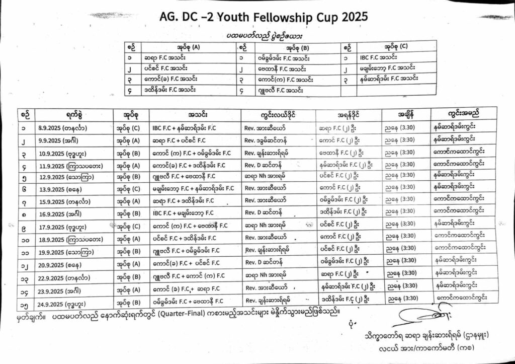 ပွဲစဉ်များကို အပတ်စဉ်(တနင်္လာနေ့မှသောကြာနေ့) အထိ တစ်ရက်(၁)ပွဲစဉ်အဖြစ်ယှဉ်ပြိုင်ကစားသွားမည်ဖြစ်ပြီး နမ်ဆာရ်ဒမ်း(လယက)၊ရပ်ကွက်(၃)ကွင်း နှင့် ကောင်ကထောင်၊ရပ်ကွက်(၄)ဘော်လုံးကွင်း တို့တွင် ညနေ (၃ : ၃၀)နာရီ မှစတင်ကာပွဲစဉ်ဇယားပါအတိုင်း ယှဉ်ပြိုင်ကစားသွားမည်ဖြစ်ကြောင်း၊ ဘောလုံးချစ်ပရိတ်များမည်သူမဆိုလာရောက်ကြည့်ရှု့အားပေးနိုင်ကြောင်း အသင်းတော် မီဒီယာစာမျက်နှာတွင် ကြေငြာထားပါသည်။